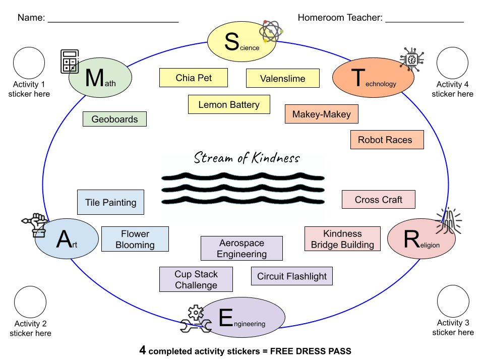 Why not extend the celebration of kindness to your school families? Family Kindness Knights are an exciting way to invite everyone to join in the fun. I created this event so that the entire school community could come together for a memorable experience of fun and fellowship. We went all out for the purpose of kindness by sharing dinner and dessert, painting kindness tiles, and participating in S.T.R.E.A.M. (science, technology, religion, art, math) activities. Did I forget to mention that there was also a D.J.? Next time we have this event, I hope to include kindness to the community by adding a non-perishable food collection for those in need.